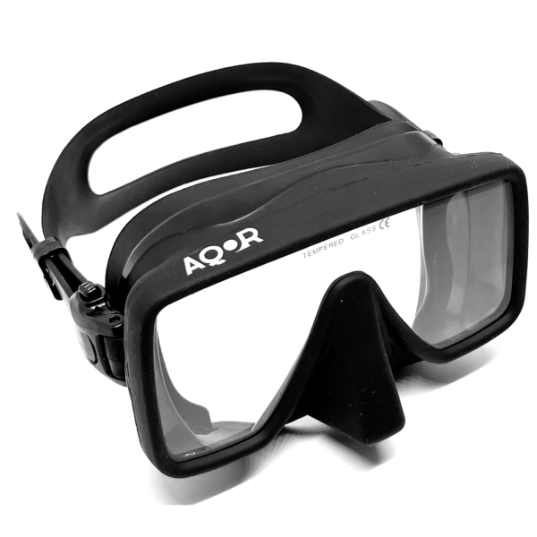 rahmenlose Tauchmaske in klassischer rechteckiger Bauform und steht für
